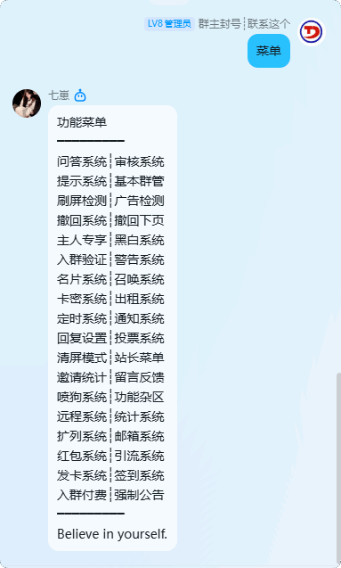 · 部分功能,需安卓框架才能使用。插件支持全局,分群,菜单自定义,好看而又强大。可通过指令配置,轻松管群,坚决扼杀广告,24H监控群消息守护你的QQ群安全!更多功能就不表述了~!