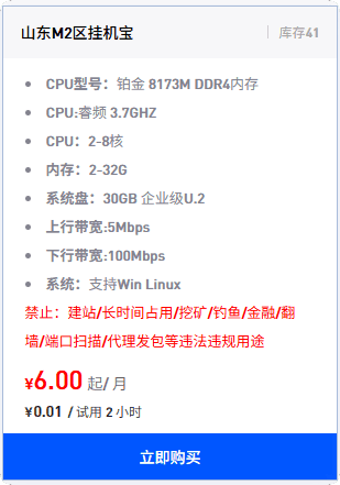 · 可以0.01元试用2小时,满意后再续费。配置自由多样、多地区可选择、售后服务也还不错!我以前也是购买的这家产品,使用过三年左右,体验还不错!现在,我自己配了电脑专门挂机器人,就没在使用挂机宝。另外,推荐这个产品,是因为成功购买后,我能分钱钱。当然你不买我也无所谓,你可以选择你自己信任的产品!